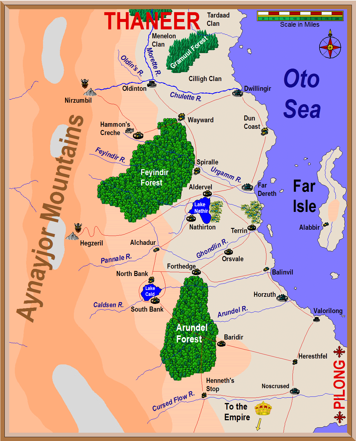 Greenish patches with small pools indicate marsh and swampland. These are named after the river or body of water from which they are formed. Thus, in the central Far Coast area the western swamp is called the Nathir Swamp and the eastern marshlands are called the Aldervel Marshes (named after the River Aldervel which is not labelled on the map but runs out from Lake Nathir past the village of Aldervel).