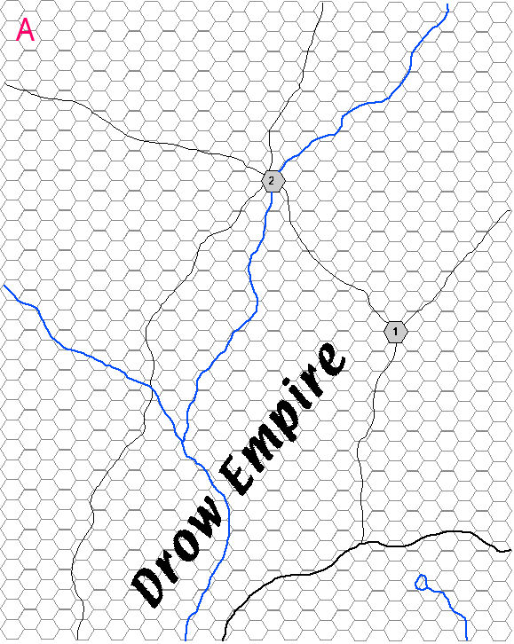 The locations below are marked on the maps. The title of each location should provide a clue as to its size and function. The three drow cities have been described in summary elsewhere. The drow city of Rabat-wruinu'ili is detailed more closely later in this scenario. The Old Ironaxe Clan and the entrances to the Old Dwarf Road are detailed in the scenario entitled "There and Back Again". Drow fortresses can be extrapolated from the DROW OUTPOST in the Entrance to the Underdark section of this scenario, though these fortresses are probably twice as large and with twice the number of troops.