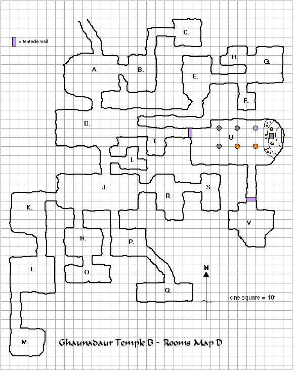 V. This chamber is warded by another Tentacle Wall, this one facing inward towards area V. While this means the party can enter area V without any trouble from the wall, returning out of the area means dealing with the wall. Use the statistics given in area U for the wall.