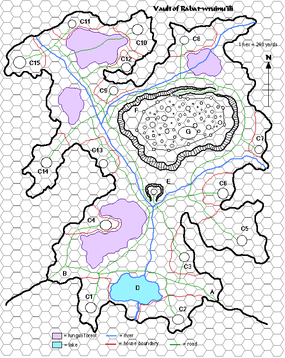 These are the estates of the Great Houses. It should be noted that the Houses hold much less power here in Rabat-wruinu'ili, where the Priesthood of Lolth rules with an iron hand. Nonetheless, 15 of the 24 drow houses have enough influence to maintain estates in the Vault. The estate boundaries are shown on the Vault map, but these are fluid borders, showing generally the extent of house patrols. The most coveted House positions are as far away from the city as possible, so as to minimize the influence of the priesthood upon the goings on of the Houses.