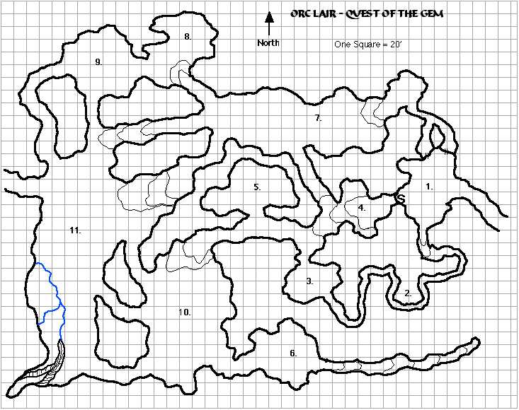 The passageway ends about 1 mile west at a secret door that alights onto a passage of the underworld little used by the drow. 6 orcish soldiers guard the entrance into Room 11 at the start of this passageway, and they bear ivory horns to sound an alarm. They are not as vigilant as the orcs in Room 1 because the likelihood of intrusion from this quarter is rare.