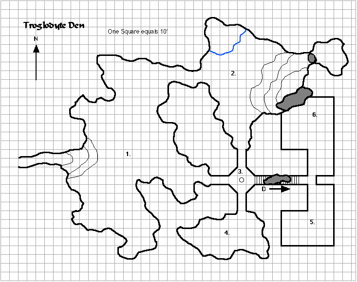 In combat, the troglodytes will raise enough of a clamour to summon the chieftain and his bodyguards from Room 4 while the females in Room 2 hide their young as indicated therein.