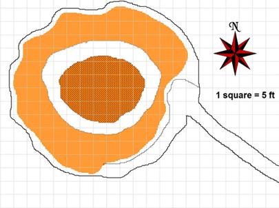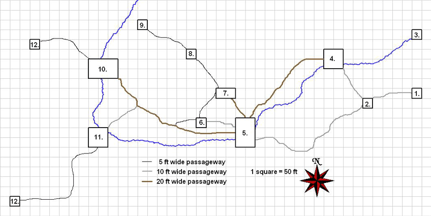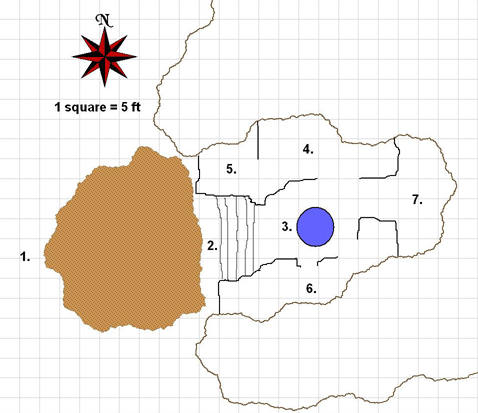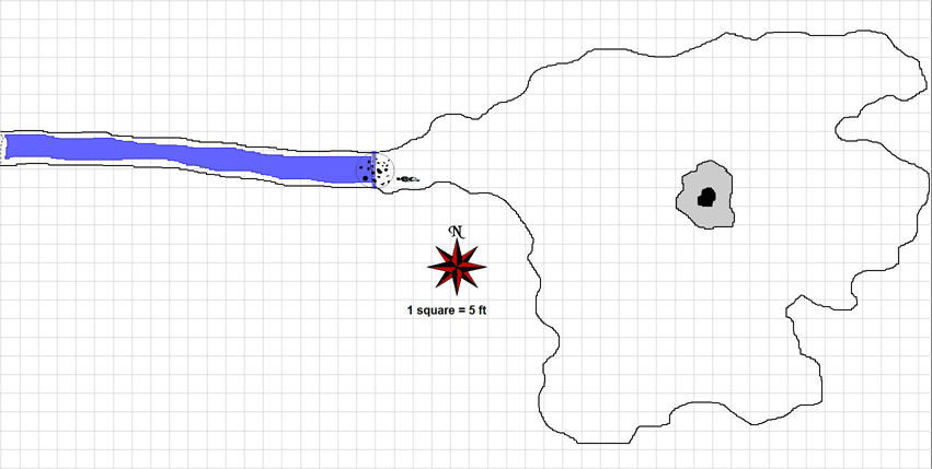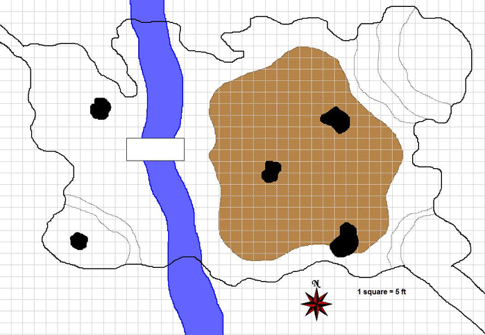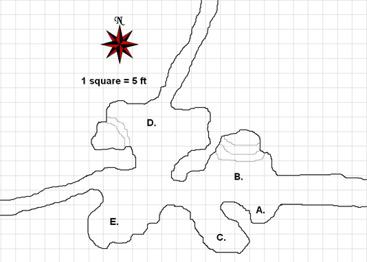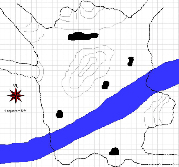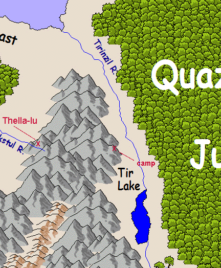 It is also possible that the PCs have stayed with the goliaths through the summer, in which case they will be in a higher camp, above the 5,000 ft level a little to the southwest of the winter camp marked on the map above. Even if the PCs have remained with the goliaths for longer than a year, they will generally be in the area near the camp marked on the map, for that is the general wandering area of the Kathaal tribe.