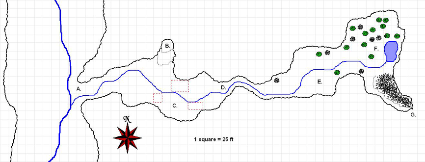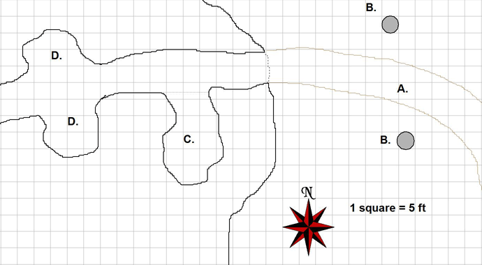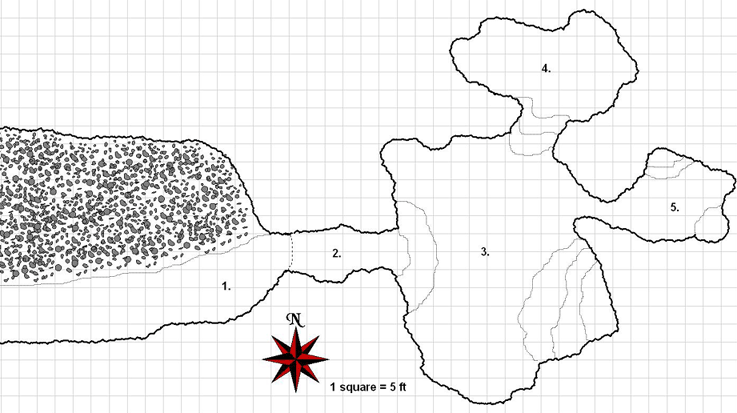 Creatures: A hunting pair of cheliceras is here, hidden in between the boulders some 20 ft up. The DM can assume they have made a Hide check of 22.