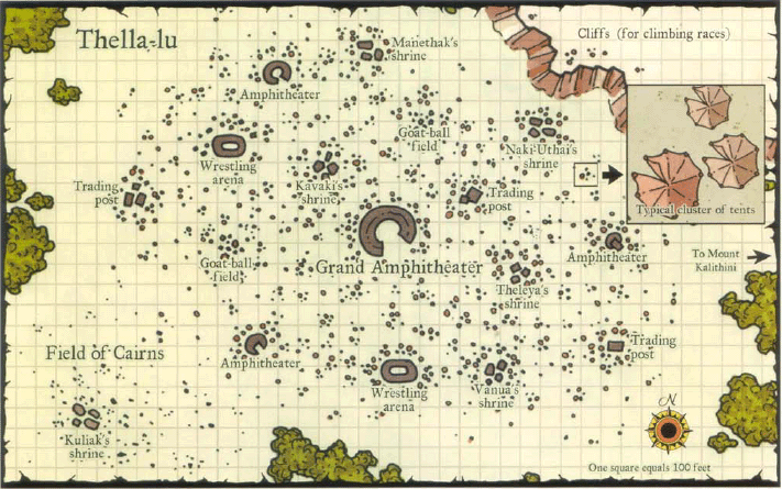 Guvagliak will present the PCs, with much obeisance, to the stonespeakers, who will question the PCs and eventually welcome them to Thella-lu and remind them that this is a place of trading and social intercourse and peace, and all who are here as guests of the goliaths are expected to maintain the peace. With that, the PCs are free to roam. Guvagliak will say his goodbyes to the PCs, telling them that after making some trades and gathering some news and passing on the same he will return to his tribe.