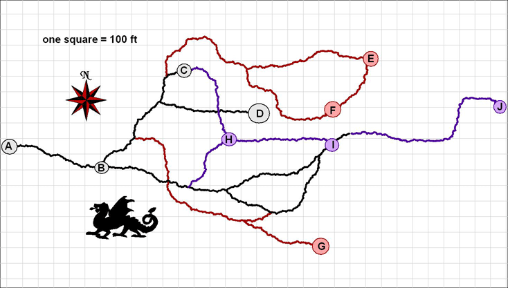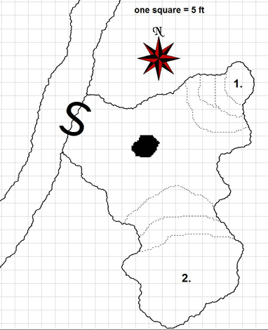 Native creatures know of and use the upper cave that leads through the curtain of vines and ivy to the hillside, but almost no one bothers to actually descend into the 40 ft deep pit to tactilely search its walls and discover the illusion. Those that do have a harrowing descent down the 45 degree angle shaft before seeing yet another seeming dead end. If they probe that and discover the second illusion, then they will have to leave the lower cave, enter the passageway, and then come to another dead end, this time not succumbing to simple touch. They would then have to find the secret door to actually enter the caves proper.