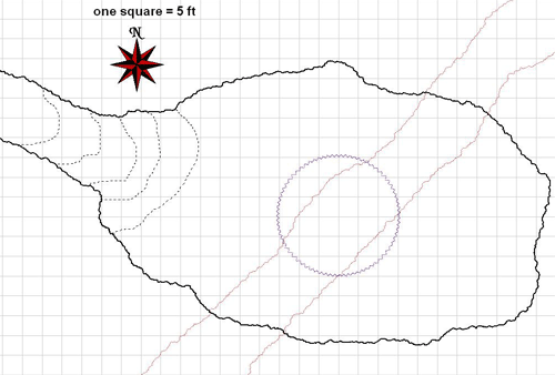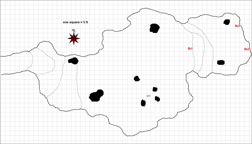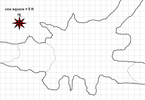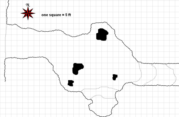 The dashed shape to the west represents the pit. The pit is 40 ft deep and seems natural as if it were formed as part of the cavern floor. The pit is fairly easy to scramble down (DC 15 Climb check just as with unworked stone). The illusory wall spell is set at the bottom of the pit in its western face.