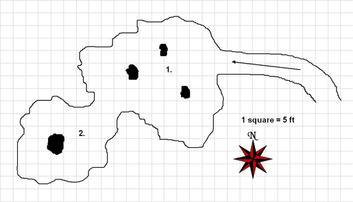 Secret Doors: The secret door to the northwest is 15 ft wide (Search DC 30) and has no discernible opening mechanism. If the skull from the dead lich is touched to the door, it will open. Otherwise, a knock spell will be needed or the door can be smashed down or bypassed. If the skull is touched to the door it will crumble. If the door is opened the skull will crumble. If the skull is removed from this chamber before the door is opened, the green lights in its eyes will dim, to return to full intensity when the skull is returned to this chamber.