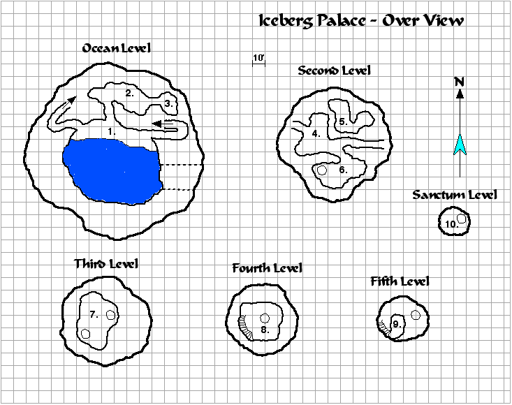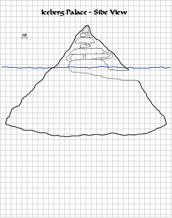 The demiplane is composed entirely of the rooms shown on the map. There is nothing beyond, as as such, no magic can allow someone to tunnel through the walls beyond a certain point. The outer walls are about 5 ft deep and then turn into an impenetrable grey nothingness. Unless otherwise stated, all places are of hewn ice and ceilings are approximately 10 ft overhead. The floors are scoured enough to allow normal movement, but running ro charging requires a DC 10 Balance check and Tumbling checks are at +2 DC.