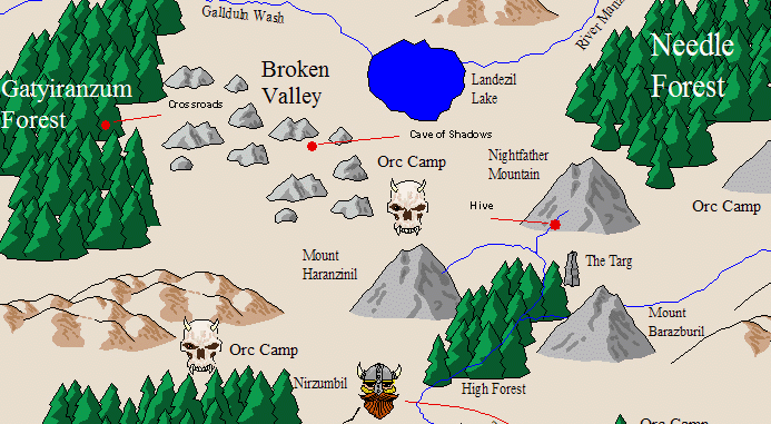 Eventually, the band moved into the region near the dwarven city of Nirzumbil. Here they found a good spot to make their home, for it was close enough to the dwarves to cause mischief, yet isolated enough to give them some security. Indeed, the recent wars between the dwarves and orcs had depopulated the region sufficiently for them to move in.