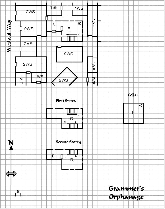 The other buildings on the Orphanage map that surround the shop are not detailed in this scenario. The DM can either refer to the Guide to Dwillingir or simply make up the purpose and residents of each location. However, a code has been provided for each building using the same codes as presented in the Guide to Dwillingir.
