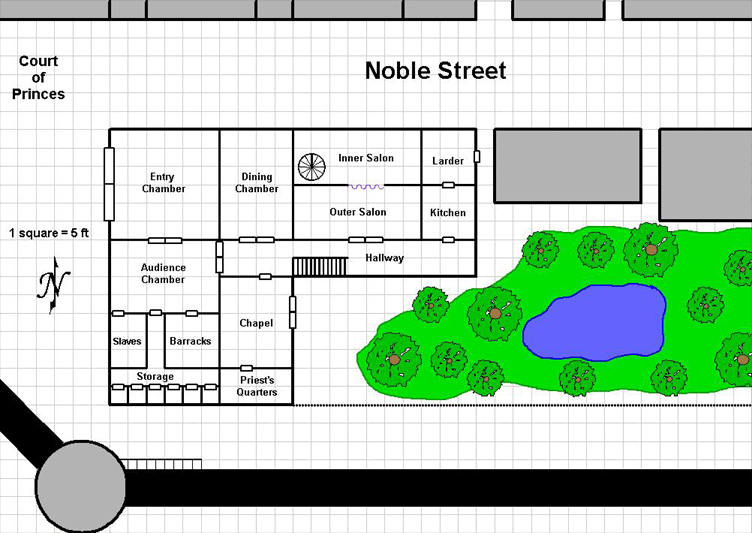 House Mercur is situated in the extreme southwest of Dwillingir, in the lee of Castle Dwillingir and its keep. in the section of town called "the Ups" in recognition of its wealthier residents. The house sits at the western end of the Street of Nobles, adjacent to the Court of Princes, and it shares a small bit of parkland with several other structures on its block.