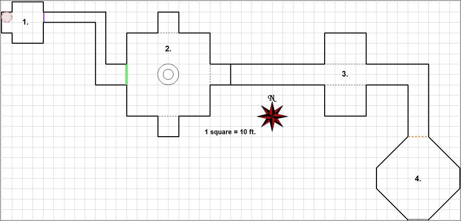 Creatures: 3 golems are present here, each housed in one of the alcoves hidden by walls. When the magic rod is NOT being held to the glowing circle just outside this chamber and if the central iron disc or pedestal are touched or moved in any way, then the walls represented by dashed lines will disappear (they are normal 1 ft thick superior masonry stone walls) and the golems will be released. The northern alcove holds an alchemical golem. The eastern alcove holds a stone golem. The southern alcove holds a mud golem.