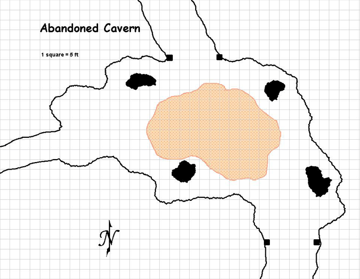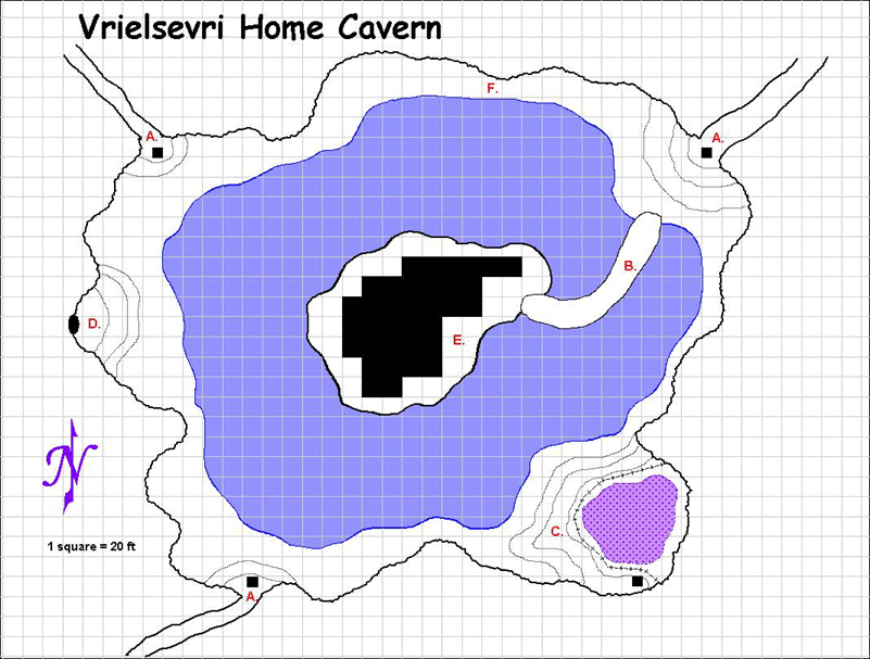 The drow delved passageway continues on to the southeast of the cavern, while a natural tunnel opens off to the west. Several large stone columns dot the cavern as indicated on the map.