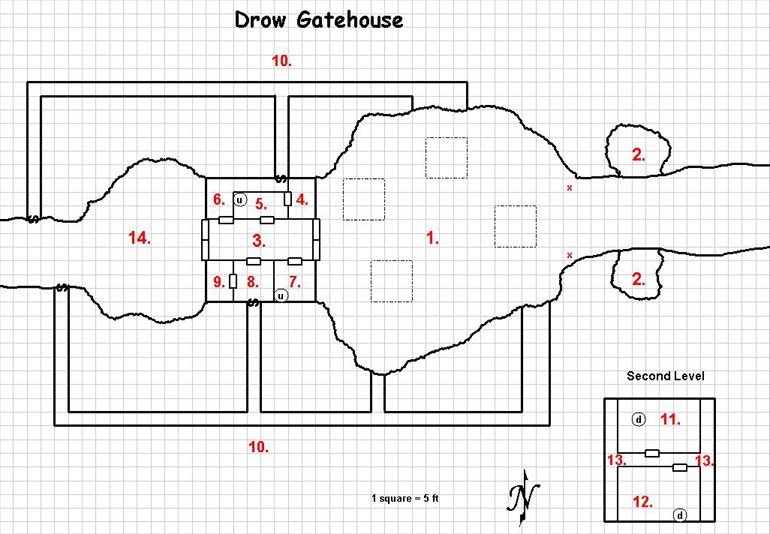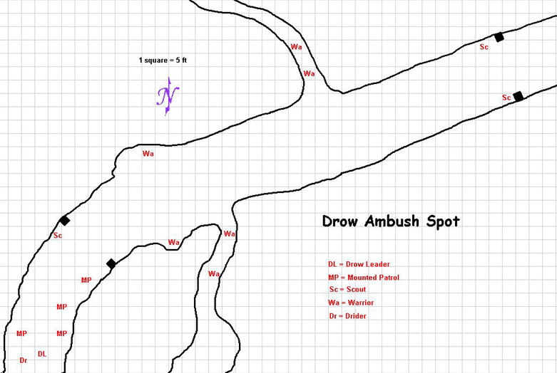 This scenario is designed on the assumption that the PCs will commence their raid all the way from the ruins of House Mercur to the Home Cavern in a single day. The ELs of the encounters generally reflect this fact, especially if the PCs simply choose to avoid or evade some of the more static encounters along the way (such as the drow gatehouse and the purple worm).