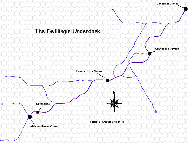 The map below shows what is essentially the main portion of the underdark in the Dwillingir region. The purple lines represent the drow passageway delved by House Vrielsevri. The blue lines represent natural tunnels. Of course, the blue lines shown only represent major natural tunnels. A myriad of smaller tunnels emanate off of the passages shown on the map, some linking up with others and others simply dead ending. Likewise, any number of small widenings and caverns will interrupt a given tunnel, including even some larger caverns not shown on the map. This means there will be no specific reason for the PCs to be especially on guard at the caverns that have encounters in them as opposed to at least half a dozen others that have none. The passages ending in arrows signify connections to the underdark as a whole.