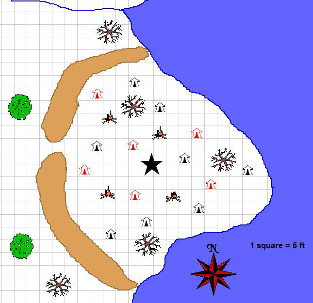 Note: The camp area is almost entirely mud. The ground is by no means even a shallow bog, but the area is, except for the trees, entirely devoid of plants. As such, an entangle spell cast into the camp will only affect those squares 8 squares adjacent to the trunk of the leafless trees.