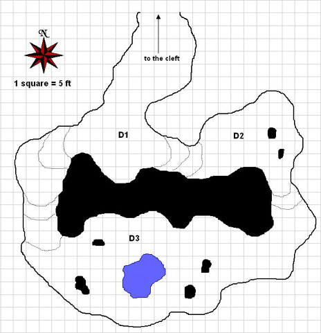 One possible avenue of attack unique to the topography of the Cleft is that the PCs might choose to simply stand at the rim of the Cleft and rain spells and missile attacks on anything that moves at the Cleft bottom. This is not a bad tactic, especially against the initial undead guardians of the place. And the worshippers might initially emerge from their caves to try to battle such attackers, but given their lack of powerful ranged attacks, it is more likely that the worshippers will eventually fall back into their caves, realizing that they are in no particular hurry and the defensive terrain of the caves favours them in such circumstances, especially since most of the inhabited cave complexes are linked to one another. Furthermore, returning hunting parties can harrass the PCs from behind and try to make their way into the caves to reinforce them.