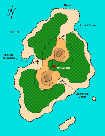 Creatures: The area between the two stretches of jungle on the western portion of the island is guarded by a dragon turtle skeleton, a prize of the lizard king priest which he brought with him all the way from Sazhansiir. It is programmed to guard the approach and attack any living creature size Small or larger which is not a lizardfolk or cave dinosaur.