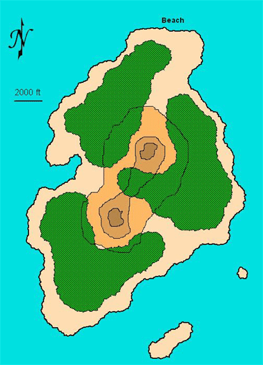 As can be seen from the island map above, the island is not very large. Contour lines represent a change in elevation of 500 ft, which makes the central highlands fairly steep (a 25 degree incline at its shallowest). Green shading represents jungle, most of it quite thick due to the heavy rainfall and the lack of any sort of clearing activity. It rains a few times a day on the island, though such showers are usually brief affairs and followed by sunlight and some fairly spectacular rainbows (in fact, the ancient inhabitants of this island, all trace of whom are now gone, called this place The Island of Rainbows).
