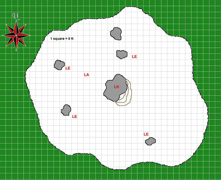 The ritual site is located in the saddle of the highlands between two peaks. The jungle on the third highest elevation is thinner than in the lowlands and is treated as medium forest and most of the area is light undergrowth (2 squares of movement, concealment with 20% miss chance, +2 to DC of Tumble and Move Silently checks).The ritual takes place in the very centre of the saddle, in a clearing that is surrounded by the jungle.