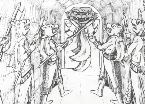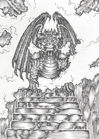 If an arm is placed within the mouth,.it will clamp shut and the teeth will puncture the arm doing 1d2 points of damage. As the blood drains into a hidden reservoir the giant batwing will start to fold back from the wall. It takes 1d3+2 rounds and 1d2 points of damage per round for the secret door to open. However, the batwing will fold across the chest of the carving, crushing the supplicant with his arm in the mouth for another 1d6 points of damage on the last round of the opening. After this crushing, the supplicance can squeeze out of the space between the wing and the mouth with a full-round action.