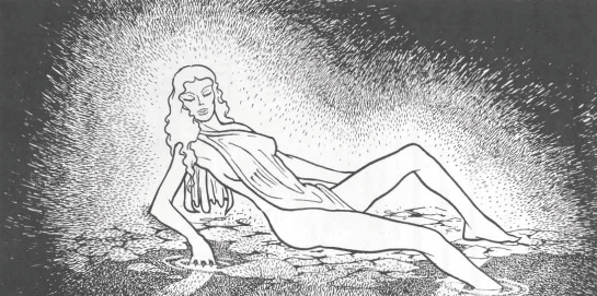 | Behind the curtain is the chalky form of a statue seated upon a stone throne carved to depict feathers. The statue is wearing a feathered headdress, made to look like a leaping fish nibbling on a water lily, and a feathered robe. Laying across its lap in its open palms is a scepter of gold and silver with an eagle's head crafted in one end and the talons of a bird holding a blazing sun in the other. The most remarkable thing about the statue is its face. |