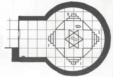 | The corridor abuptly widens to a 15 ft square area with a corrugated floor. In the ceiling of this cubicle, 15 ft overhead, a bronze, circular trapdoor is set. The cover is latched shut from this side. In the our corners of this foyer are sets of metal rungs that lead up and across the arched ceiling to the trapdoor. The rungs are broken in several places and form rusty spikes. Across the widening the 5 ft wide corridor continues on. |