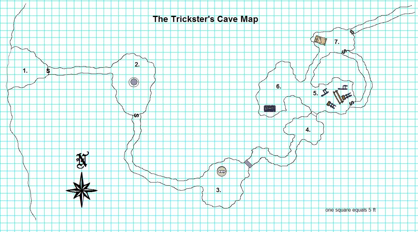 The map leads to a small cave opening in the woods to the west of Dwillingir, some 8 miles towards Ocra's Woods. Refer to the Trickster's Cave Map when reading the detailed descriptions below.