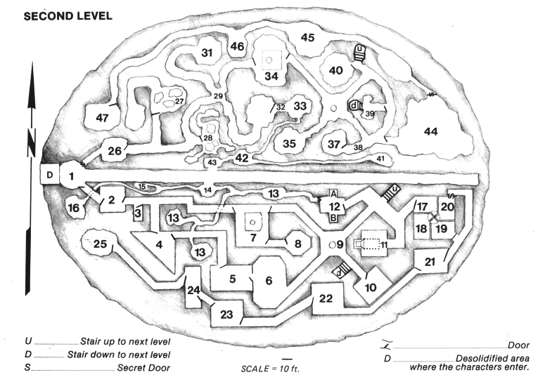 Gelatinous Cube - 1 of these cubes will be encountered, possibly with a gibberling floating within, so that it may appear to the party as if a gibberling is floating towards them in midair. Similarly, it may have scooped up a sword or weapon and that may be seen floating towards the party. The cube(s) clean our trash from the corridors. Although they tend to wander into persons' lairs and are slain, new ones seem to generate spontaneously from time to time.