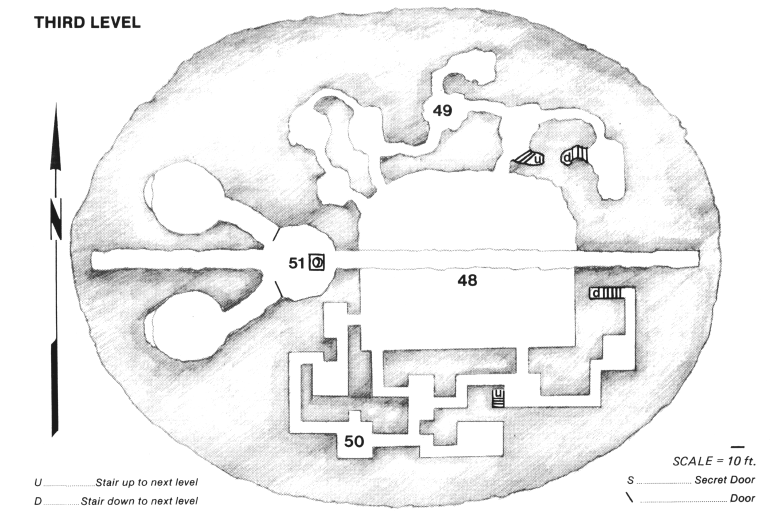 The party will emerge into a small circular room, some 100' in diameter. Ever-burning mauve torches cast flickering shadows along the walls.