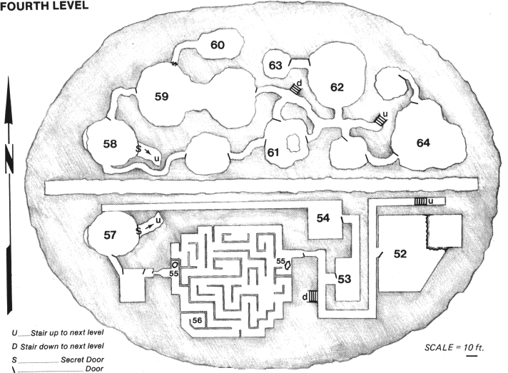The steps from the throne room (Room 51) descend some 150' before landing at a small hallway 10' wide and 15' long. At its end is a glowing pink archway. Nothing can be seen past the archway.