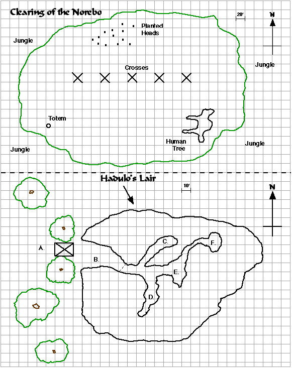 The Situation: On Fermengarr Isle in the Heynosht Archipelago dwell a primitive people of mixed Morakki stock. Some months previous to the party's arrival, a young woman named Kelanni was betrothed to a young tribesman named Varrin. This betrothal angered another young tribesman named Hadulo. Kelanni and Hadulo had been in love for many years and eagerly hoped to be married. Just before Kelanni's betrothal age of 17 years, Hadulo's father was charged with cowardice by the tribe during a raid by sahuagin. Hadulo's family was disgraced, and Kelanni's parents refused Hadulo's offer of marriage, not wanting their daughter to marry the son of a coward. Instead, Kelanni was betrothed to Varrin.