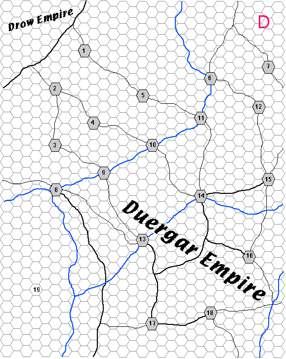 The locations below are marked on the maps. The title of each location should provide a clue as to its size and function. The three drow cities have been described in summary elsewhere. The drow city of Rabat-wruinu'ili is detailed more closely later in this scenario. The Old Ironaxe Clan and the entrances to the Old Dwarf Road are detailed in the scenario entitled "There and Back Again". Drow fortresses can be extrapolated from the DROW OUTPOST in the Entrance to the Underdark section of this scenario, though these fortresses are probably twice as large and with twice the number of troops.