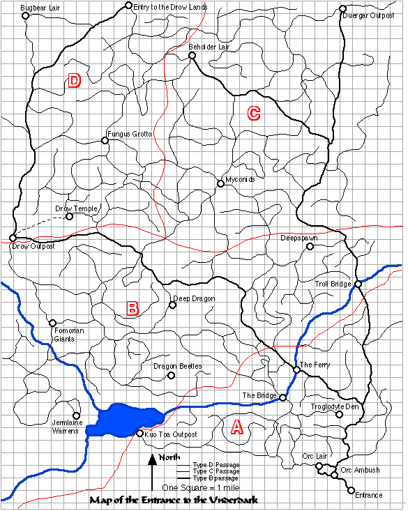 This area of the underdark is divided into 4 rough zones, noted as A, B, C, and D in red lettering on the Entrance to the Underdark map. These zones are demarcated by red borderlines.