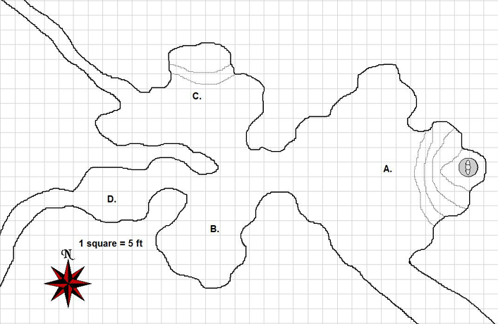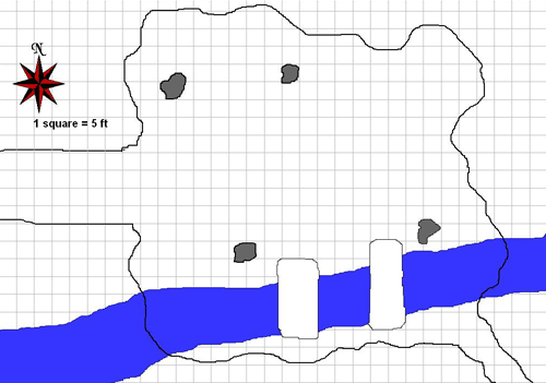 It is also possible that the PCs have stayed with the goliaths through the summer, in which case they will be in a higher camp, above the 5,000 ft level a little to the southwest of the winter camp marked on the map above. Even if the PCs have remained with the goliaths for longer than a year, they will generally be in the area near the camp marked on the map, for that is the general wandering area of the Kathaal tribe.