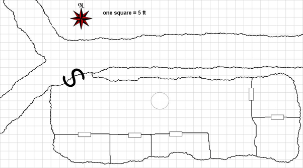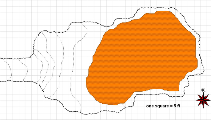 The dashed shape to the west represents the pit. The pit is 40 ft deep and seems natural as if it were formed as part of the cavern floor. The pit is fairly easy to scramble down (DC 15 Climb check just as with unworked stone). The illusory wall spell is set at the bottom of the pit in its western face.