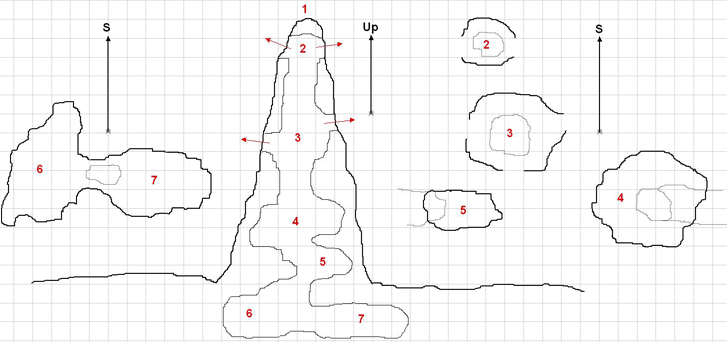 Native creatures know of and use the upper cave that leads through the curtain of vines and ivy to the hillside, but almost no one bothers to actually descend into the 40 ft deep pit to tactilely search its walls and discover the illusion. Those that do have a harrowing descent down the 45 degree angle shaft before seeing yet another seeming dead end. If they probe that and discover the second illusion, then they will have to leave the lower cave, enter the passageway, and then come to another dead end, this time not succumbing to simple touch. They would then have to find the secret door to actually enter the caves proper.