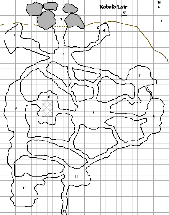 Like the Spy Cavern (area 3), this small cave's northern end has a spyhole that looks out over the entrance to the lair. A single male kobold is always here watching for trouble. There is a single ratty pallet here and a bit of refuse.
