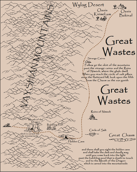 Likewise, it is possible that the PCs, on their journey to the graveyard, somehow captured or charmed a creature so that they have access to it but the creature has not drunk a memory draught. Of the creatures encountered during the adventure, the two most likely to fit this criteria are the loquasphinx and the djinni. The latter will be of no help to the PCs, as it has been magically compulsed by the Lord of Palliag never to divulge the location of the graveyard (for reasons different than Angarlok's!). The djinni cannot communicate the location in any way, nor can it even think it as a surface thought. In any event, remember that the PCs will not even be able to muster the will to ask the djinni until the initial effects of the draught thaw.
