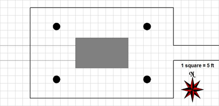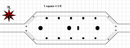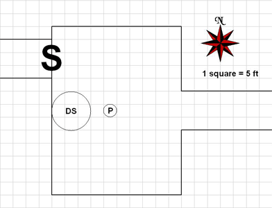 Secret Doors: The secret door to the northwest is 15 ft wide (Search DC 30) and has no discernible opening mechanism. If the skull from the dead lich is touched to the door, it will open. Otherwise, a knock spell will be needed or the door can be smashed down or bypassed. If the skull is touched to the door it will crumble. If the door is opened the skull will crumble. If the skull is removed from this chamber before the door is opened, the green lights in its eyes will dim, to return to full intensity when the skull is returned to this chamber.