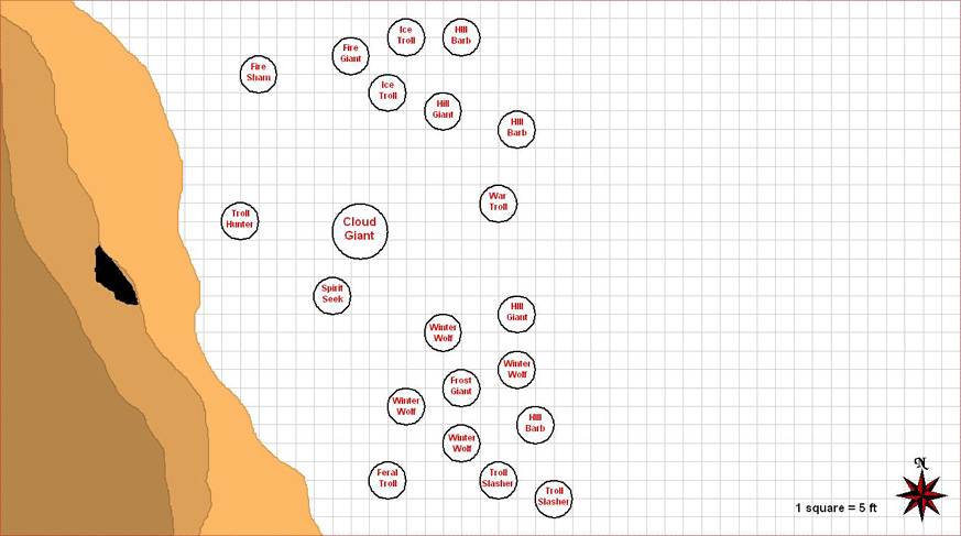 The minions are normal camped outside the cave entrance. If they know the PCs are about to arrive, they will be arrayed in a skirmish line of sorts some distance before the cave, as illustrated on the map below.
