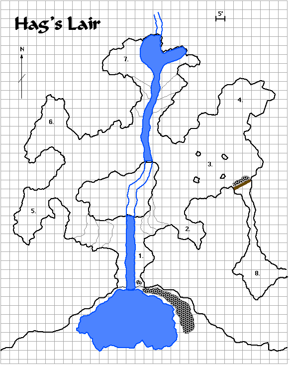 The hag also has three kobold slaves lairing with her. The slaves are fairly useless as combatants, but are good sneaks and provide a watch on the entrance to the lair. One of these little creatures is always hiding amongst a cluster of rocks at the edge of the cave opening, with a good view of the pool and clearing surrounding it.
