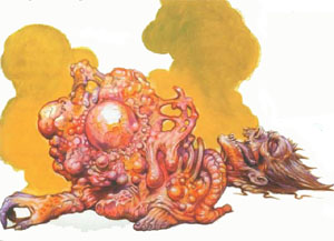 Developments: There is no way to return the necromancer to life. Even a wish or miracle spell will not accomplish this. The cosmic forces she impregnated herself with are too powerful and have too infused themselves into her essence for there to be anything left of her to restore beyond the last glimpse of consciousness that the PCs witnessed. If it is killed, then the sickening aura will disappear, which should be a sign for the PCs that they have at least stopped the curse from spreading and accomplished their mission. Speak with dead spells will not function, as the necromancer is no longer around to speak with and the cyst has no means of communicating and too alien a mental framework to bother with in any event.
