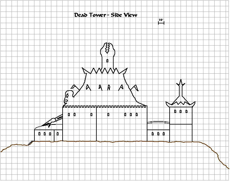 Within is a long passageway about 6 ft high which winds a long ways to the north, descending all the while down long stairs, until it arrives at an isolated cove with a small sandy beach. Here is a small twelve-man row boat with a mast. Within the boat are provisions for one person for twenty days, including fresh water, and a map of the surrounding seas and islands in a sealed tube. This is where the necromancer can escape in an emergency and also where supplies ordered from afar are taken into the tower.