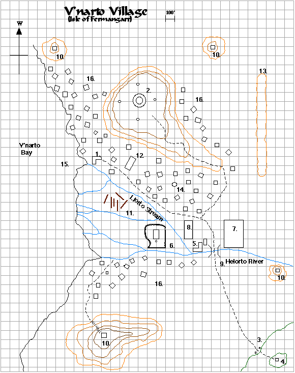 The return trip to V'narto village should be fairly uneventful, though at the DM's option another warped creature could make an attack. This is not recommended, however, as it is likely to confuse the PCs into thinking they did not end the curse and return to the Dead Tower.
