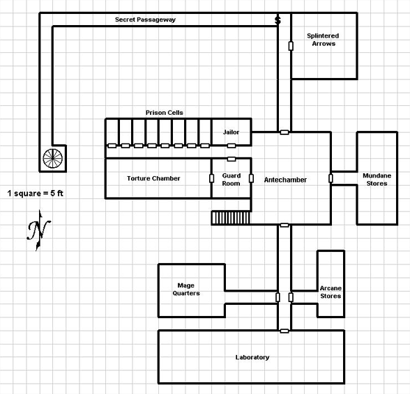 The building is of solid stone, with exterior walls being 2 ft thick and comprised of 1 outer ft of superior masonry and an inner 1 ft of reinforced masonry. This gives the walls a hardness of 8, 270 hp, a break DC of 45, and a Climb DC of 25.