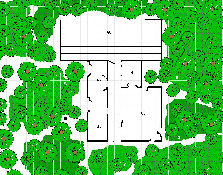 Despite the lack of green on the map where the ruins are shown, the ruins are entirely overgrown with ivy, creepers, vines, and other foiliage. Dirt climbs up its sides and grass and bushes grow on the dirt. As such, the ruins only poke through the greenery now and then, mainly at the fron entrance (area 1). The other breaks in the outer walls of the ruins are difficult to notice, due to shadows and hanging ivy and vines. As such, it requires a DC 10 Spot check to notice them from any distance greater than 10 ft.
