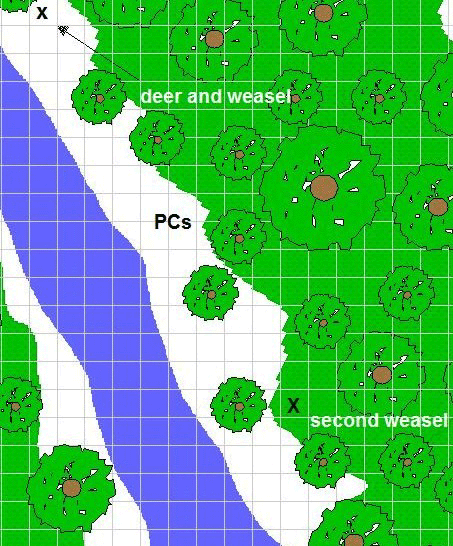 In the meantime, the dire weasel's companion has finally caught up with its mate, and was expecting to feast on the deer. Instead, from the opposite direction on the side of the PCs away from the deer, it suddenly caught scent of the PCs and is now sneaking up on them (presumably from behind if they are watching the deer and the other dire weasel). The second weasel will croodle up to the PCs from behind and then attempt to leap upon and take one of the PCs as its prey.