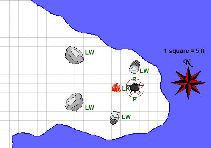 There are 4 campfires in the camp. These are built into small shelters of mud some 2 ft tall and 2 ft in diameter. These have openings facing roughly toward Deerman's Pond, such that the light from the fires only illuminates along the ground and is therefore not visible from ground level from a distance beyond the earthen berm. However, the fires do provide heat for the lizardfolk and light enough to fully illuminate the central area of the camp and put most of the rest to the east of the fires in shadowy illumination.